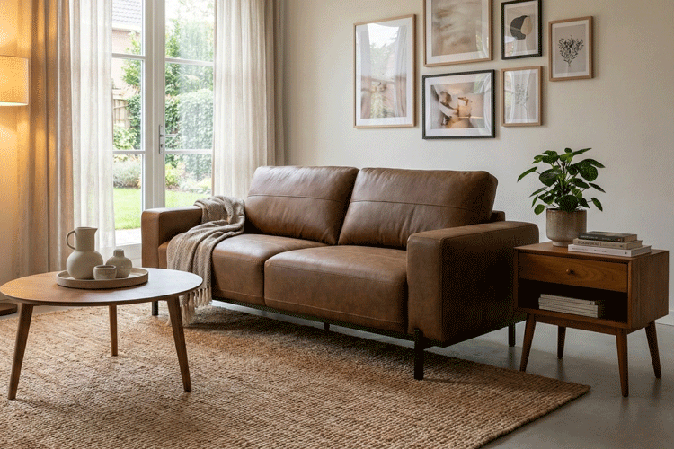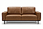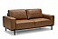 This contemporary two-seater sofa features rich aged tan brings warmth and sophistication to any living space. It is designed with broad, square armrests and plush back cushions accented by subtle horizontal stitching for added visual interest. A slender matte black metal frame provides sturdy support while adding a sleek, industrial touch to its modern silhouette.