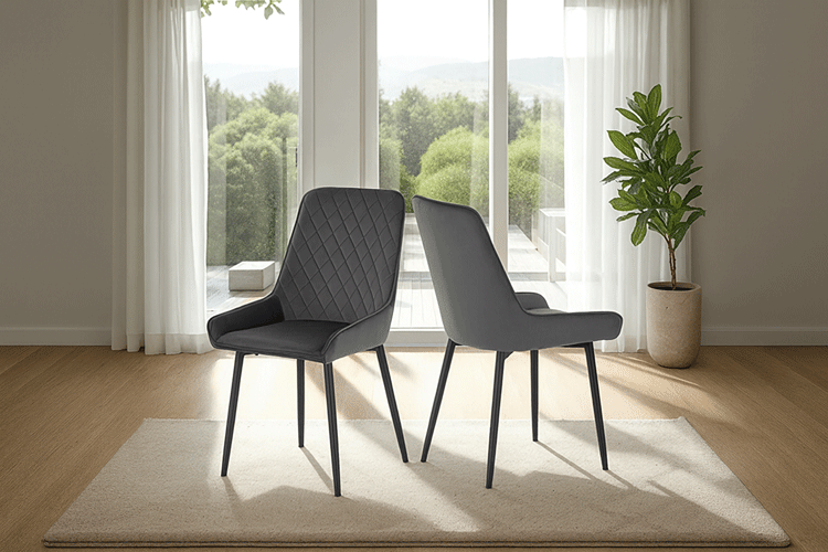 The Ava Chair is blending luxurious comfort with contemporary design, featuring plush grey velvet upholstery and sleek black metal legs. It offers a curved back for support and generous padding for comfort, constructed with durable materials and measuring: