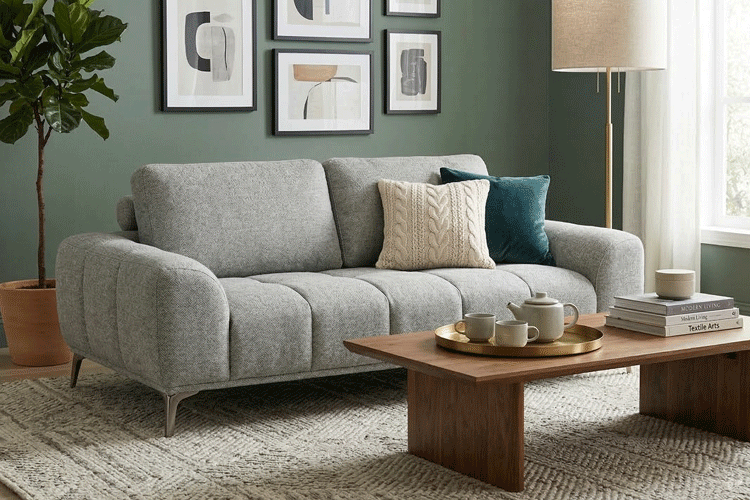 This modern sofa features a textured, moss-green upholstery that brings a touch of elegance to any contemporary living space. Its striking design highlights a plush, tufted seat alongside uniquely channeled wide armrests, all elevated by sleek metallic legs. Designed for both style and relaxation, it includes plush back cushions paired with a supportive cylindrical bolster roll for the perfect lounging experience.