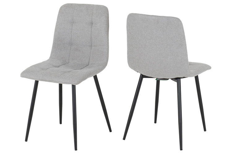 The Lucca Dining Set features four light grey fabric Lucca chairs paired with the sleek, modern Portland table. The chairs offer soft upholstery, gently curved backs, and refined stitched detailing, while the table’s white top and slim black legs bring a clean, contemporary finish to your dining space.