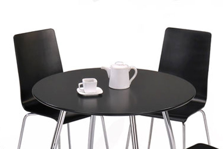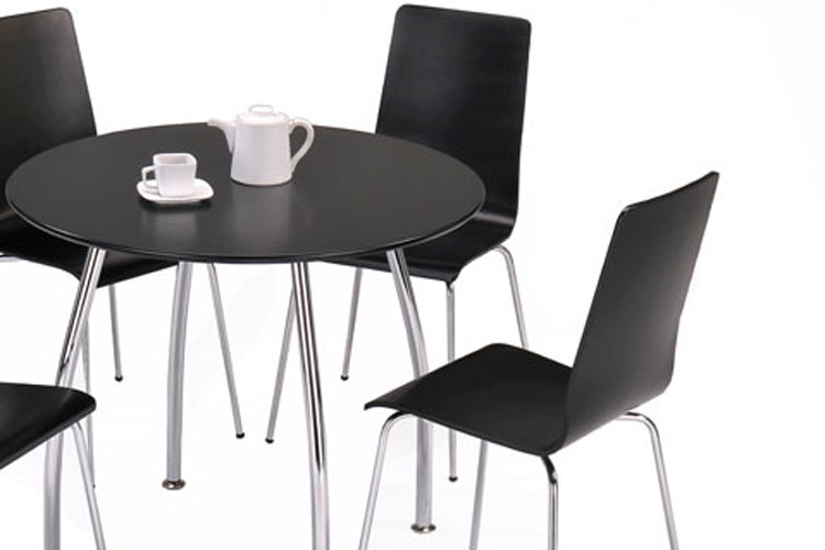 Modern black lacquered round table and black chairs with contemporary chrome legs. Table with four legs is ideal to give stability and flexibility of chair position. Useful when space is tight.