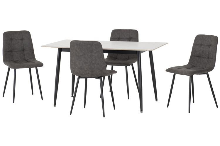 The Tampa Dining Set pairs four dark grey suede Tampa chairs with the crisp, modern Portland table. The Tampa chairs feature soft-touch upholstery, supportive curved backs, and vertical stitching for a sleek, tailored look. Combined with the white table and black legs, this set brings effortless style to any space.