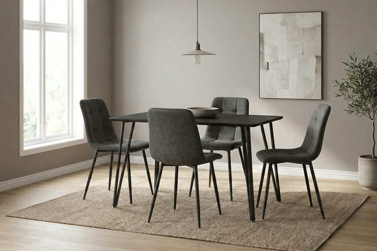The Tampa Dining Set pairs four dark grey suede Tampa chairs with the crisp, modern Harlow table. The Tampa chairs feature soft-touch upholstery, supportive curved backs, and vertical stitching for a sleek, tailored look. Combined with the black marble stone effect top and black legs table, this set brings effortless style to any space.