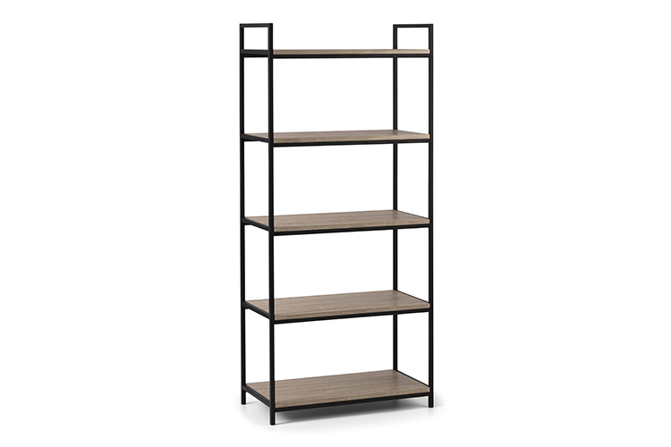 A cool, modern bookcase designed to add a contemporary touch to any home or work place. Its simple clean lines, delineated by a subtle, black coated metal frame are complemented perfectly by a warm, sonoma oak foil, to create a very stylish and sleek product