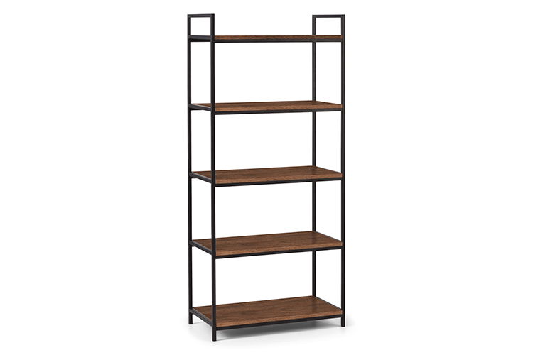 A cool, modern bookcase designed to add a contemporary touch to any home or work place. Its simple clean lines, delineated by a subtle, black coated metal frame are complemented perfectly by a warm, walnut foil, to create a very stylish and sleek product